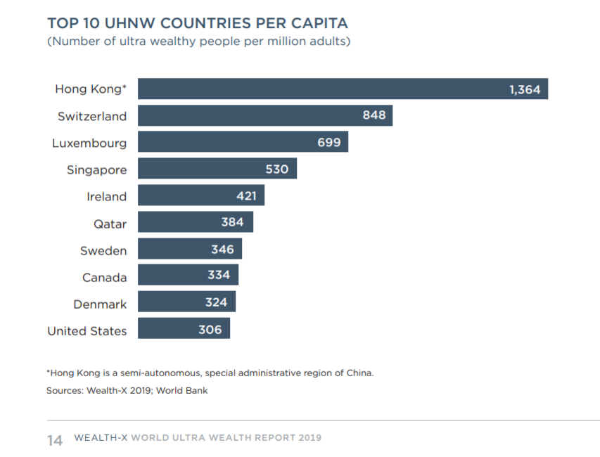 The Twenty-Six Counties is ranked as having the fifth highest per capita concentration of ultra-wealthy individuals in the world. Only Hong Kong, Switzerland, Luxembourg and Singapore are rated higher.