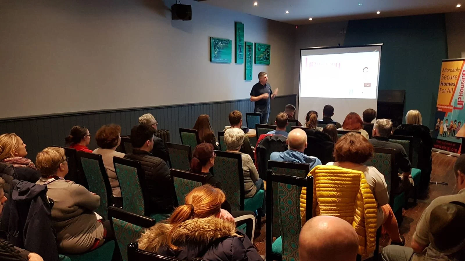 Over the last few months a full suite of UP Housing campaign materials have been produced, including stickers, leaflets, posters, banners, pop-ups, petition sheets etc. Public meetings have been organised in a number of areas and more are planned for the future. Information and petition stalls are also being organised within communities on a regular basis. This real-world activity is complimented by a growing online operation to explain and encourage support for UP Housing. All of these activities are the tested and proven tools of campaign building.
