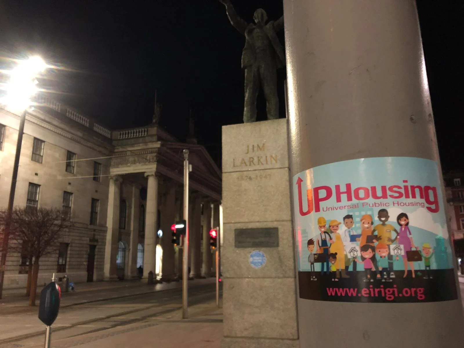 UP Housing sticker with Jim Larkin’s statue and the GPO in the background.