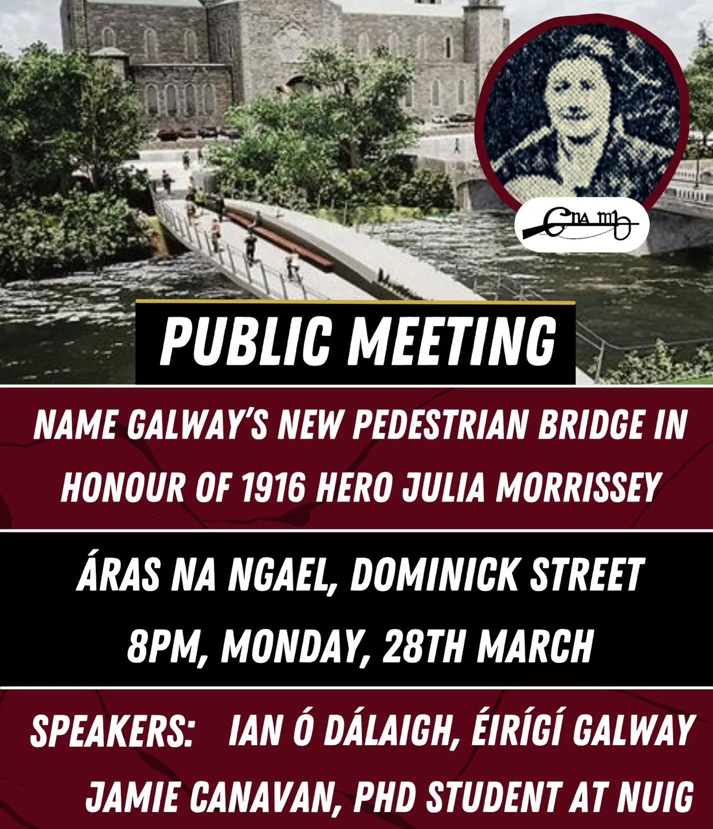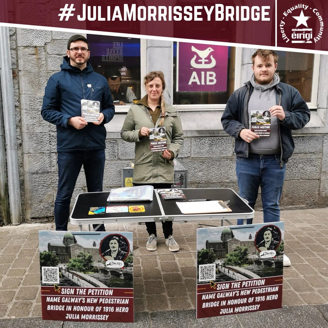 Éirígí Galway have organised a public meeting to build support for the 'Julia Morrissey Bridge' campaign. The meeting will take place at 8pm in Áras na nGael, Dominick Street in Galway City on Monday 28th March. Almost 400 people have already signed the Julia Morrissey Bridge online petition.