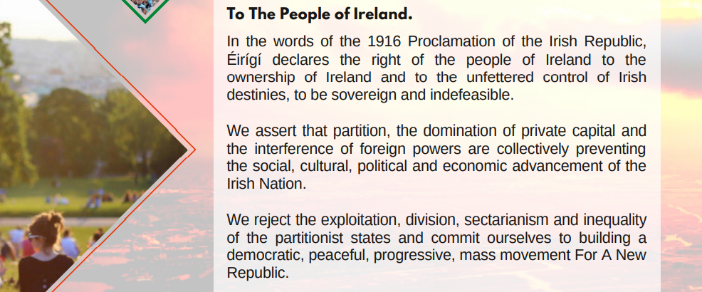 We ask you to read A Democratic Progamme For A New Republic here. And if you find yourself in general agreement with our analysis and our ideas, then we ask you to give serious consideration to joining Éirigí and the 230-year-old struggle to establish an Irish Republic. Join us here.