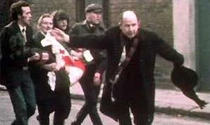 Catholic priest Edward Daly waving a blood-stained white handkerchief as a white flag while trying in vain to escort the mortally wounded Jackie Duddy to safety.