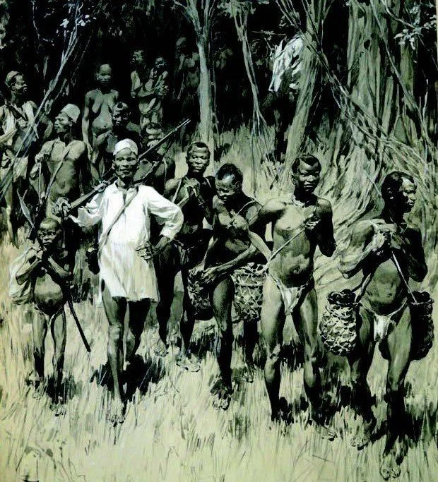 It used to take ten days to get the twenty baskets of rubber—we were always in the forest and then when we were late we were killed. We had to go further and further into the forest to find the rubber vines, to go without food, and our women had to give up cultivating the fields and gardens. Then we starved. Wild beasts—the leopards—killed some of us when we were working away in the forest, and others got lost or died from exposure and starvation, and we begged the white man to leave us alone, saying we could get no more rubber, but the white men and their soldiers said: ‘Go! You are only beasts yourselves, you are nyama (meat).’ We tried, always going further into the forest, and when we failed and our rubber was short, the soldiers came to our towns and killed us. Many were shot, some had their ears cut off; others were tied up with ropes around their necks and bodies and taken away.